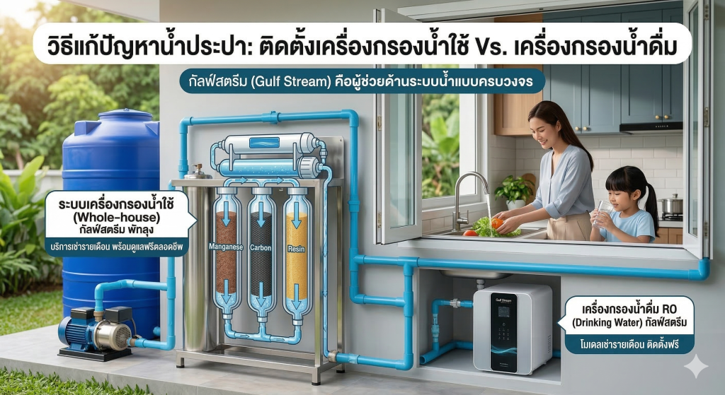 อย่าปล่อยให้น้ำประปาขุ่น กลิ่นแรง ทำร้ายสุขภาพและเครื่องใช้ไฟฟ้าในบ้านคุณ เลือกกัลฟ์สตรีมเป็นผู้ดูแล ติดต่อสอบถามบริการเช่าเครื่องกรองน้ำใช้ หรือออกแบบระบบน้ำฟรี!